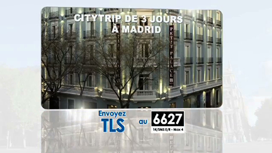 Remportez 1 semaine pour deux à Madrid par Télésambre Publié le 01 septembre 2014 à 01:01 |Mis à jour le 29 janvier 2024 à 10:47 Partager Règlement du concours Télésambre Recommandations Image 28/08/2018 Gagnez 3x2 places pour le Festival Ombres et Lumières Image 21/08/2018 Gagnez 9x2 places pour le Festival Vapeur Image 15/08/2018 Gagnez 8x2 combi pour le PACrock Festival Image 15/08/2018 Gagnez 25x2 entrées pour Scène-sur-Sambre! Image 12/08/2018 Gagnez 5x2 entrées les contes coquins (Maison du Conte) Image 01/08/2018 Gagnez des entrées pour la Nuit des Choeurs Image 30/07/2018 Gagnez des entrées pour les Féeries de Beloeil Image 27/07/2018 Gagnez des entrées pour les Scottich Days Image 29/06/2018 Molières et Mocassins : Biche Ã? Labiche Image 29/06/2018 Remportez 5x2 entrées pour Les cloches de Corneville (Renouveau lyrique) Image 24/06/2018 Remportez 30 BD - Les Diables Rouges (l'épopée russe) Image 12/06/2018 Gagnez des entrées pour Le Kino Festival de Charleroi Image 07/06/2018 Gagnez 10 livres ''Football 90's'' (Editions du Pays noir) Image 07/06/2018 Gagnez 10x2 entrées pour le concert ''Stars80'' (Spiroudôme) Image 06/06/2018 Gagnez 25x2 entrées pour le Vintage Music Festival (Abbaye de Villers-la-Ville)