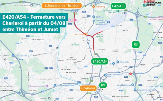Travaux : l’E420/A54 fermée vers Charleroi, entre Thiméon et Jumet