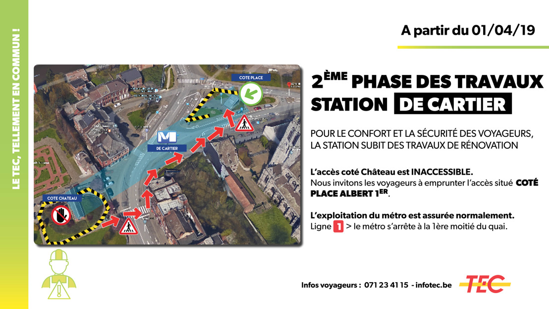 Les travaux de rénovation, entamés en mai 2018 par la Direction Charleroi et la Direction Générale du TEC à la station De Cartier à Marchienne-au-Pont, entreront dans leur seconde phase dès le 1er avril 2019.