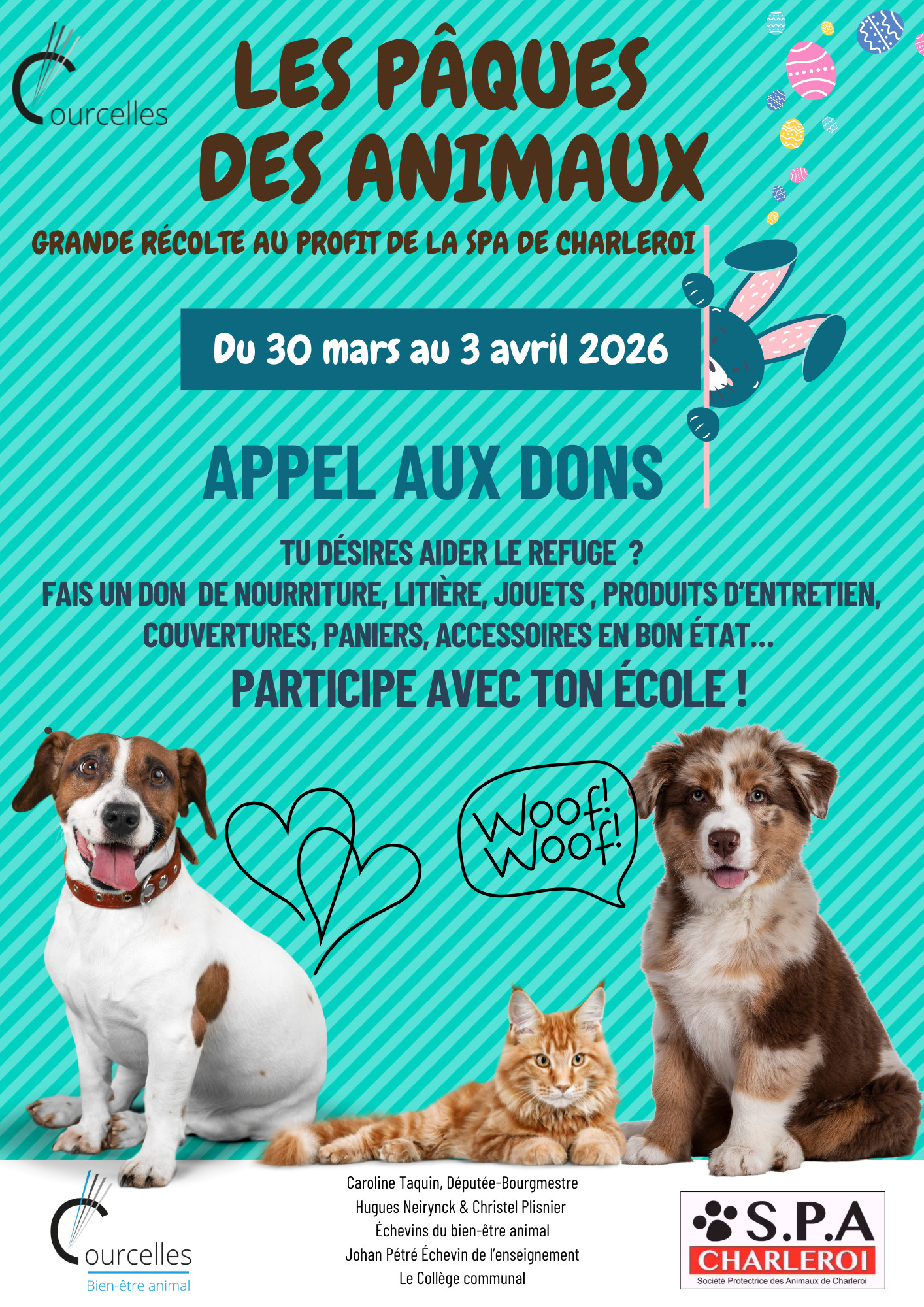 « Le bien-être animal est une responsabilité collective. À travers cette action, nous souhaitons sensibiliser nos citoyens, et en particulier les plus jeunes, à l’importance du respect et de la protection des animaux. La générosité des Courcelloises et des Courcellois est une force, et je suis convaincue que cette mobilisation apportera un réel soutien à la SPA de Charleroi et aux animaux qu’elle protège. »