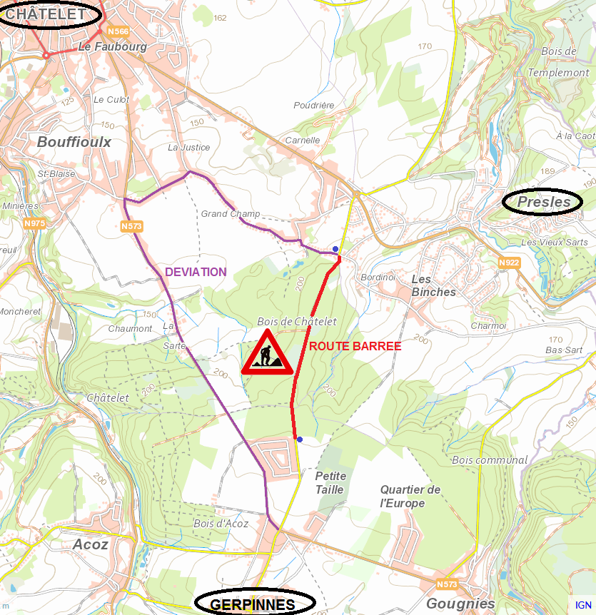 L’entreprise GKW bvba agissant pour le compte de la SWDE interviendra à la rue de Presles à GERPINNES et CHATELET à partir du 04/11/2019 pour une durée estimée de 85 jours ouvrables. Tronçon dans le bois de Chatelet (de la fin du quartier des Nations à Gerpinnes jusqu’à la rue des Binches à Chatelet).