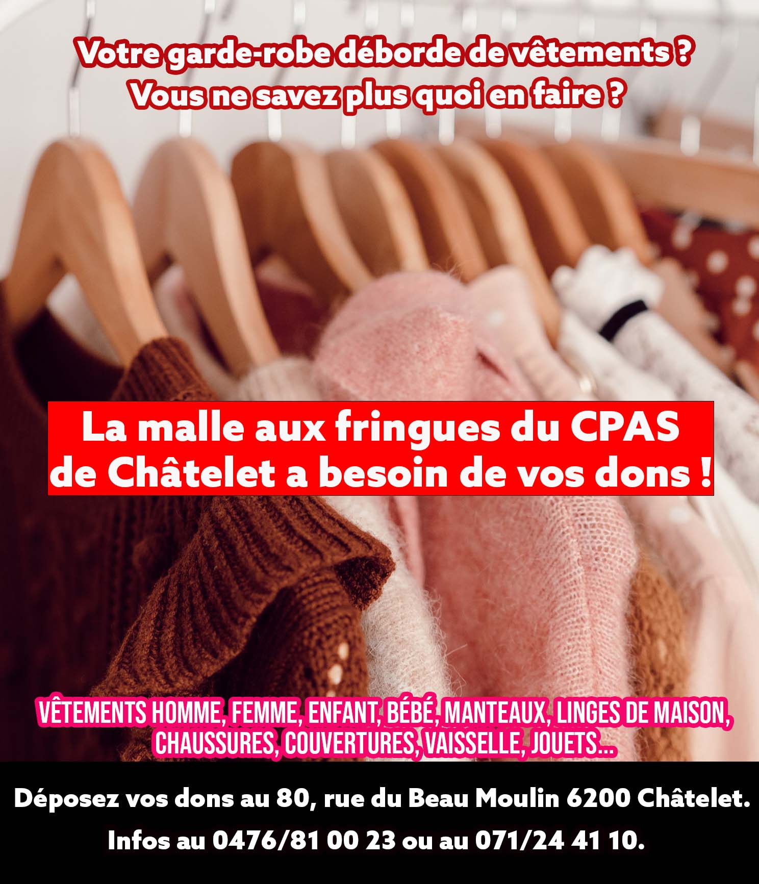En ces temps difficiles, le CPAS de Châtelet a plus que jamais besoin de vos dons, pour répondre aux besoins importants de la population. C’est pourquoi, « La Malle aux Fringues » de l’institution, récolte des vêtements et des chaussures pour homme, dame et enfant, mais aussi des couvertures, du linge de maison et des jouets.