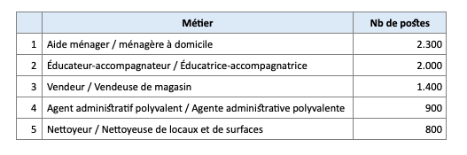 Enfin, plus de 1000 projets d’embauche concernent une quinzaine de professions détaillées sur le site internet du Forem, on y retrouve notamment des emplois comme Agent administratif, Employé de magasin ou Aide-soignant.