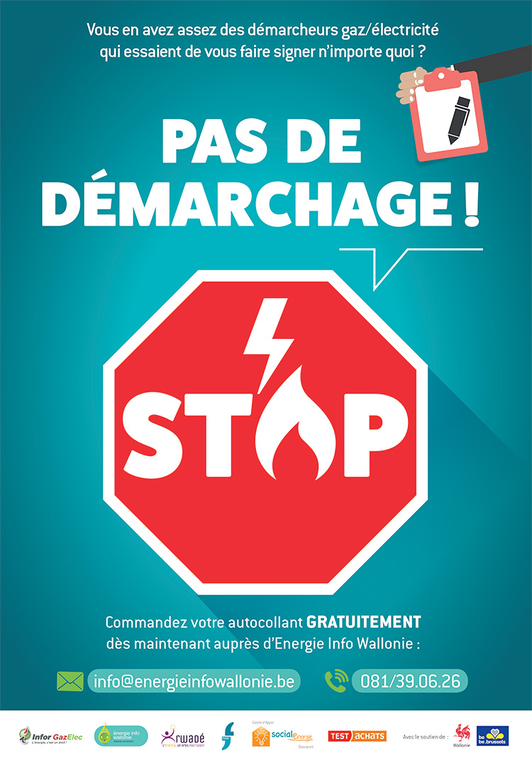 N'hésitez pas à contacter la Zone de Police si vous vous faites démarcher abusivement. Sachez que vous pouvez également commander un autocollant "Pas de démarchage" comme indiqué sur l'image.