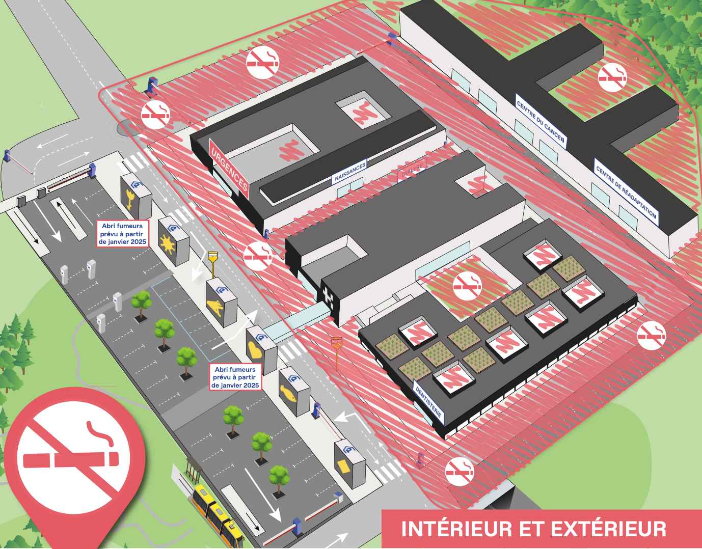 Voici (en rose) la large zone où il sera désormais interdit de fumer du le site des Viviers du Grand Hôpital de Charleroi :