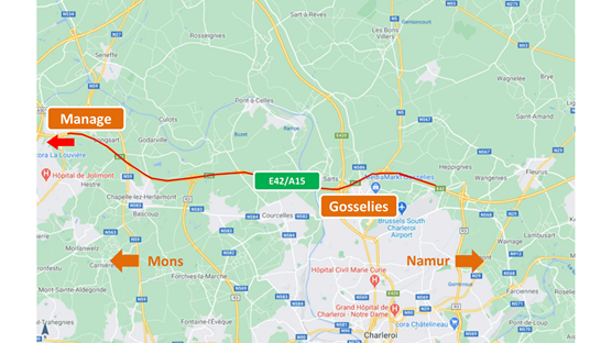 Du lundi 4 janvier au vendredi 22 janvier au plus tard, soit pour une durée maximale de trois semaines, des réparations localisées de revêtement impacteront la bande de droite de l’autoroute E42/A15 entre Gosselies (depuis le parking de l’aire des Amoudries) et Manage uniquement en direction de Mons.
