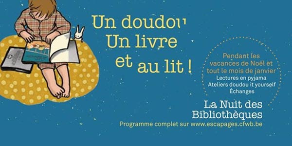 La Nuit des Bibliothèques "Un doudou, un livre et au lit !" en est déjà à sa 9ème édition. Et comme toutes activités du genre, elle s'adapte aux recommandations sanitaires fédérales. Mais le festival a bien lieu pour permettre aux familles de vivre un moment de lecture ou d'activités en mode cocoon.