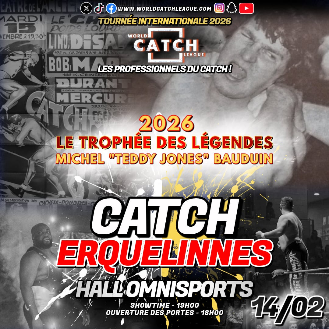 Cette date marquera le premier arrêt d’une tournée de plus de 30 événements à travers la Belgique, la France, les Pays-Bas et le Luxembourg. Erquelinnes accueillera l’édition 2026 du Trophée des Légendes, distinction annuelle rendant hommage aux figures marquantes du catch. Cette année, la World Catch League honorera aussi Michel “Teddy Jones” Bauduin.